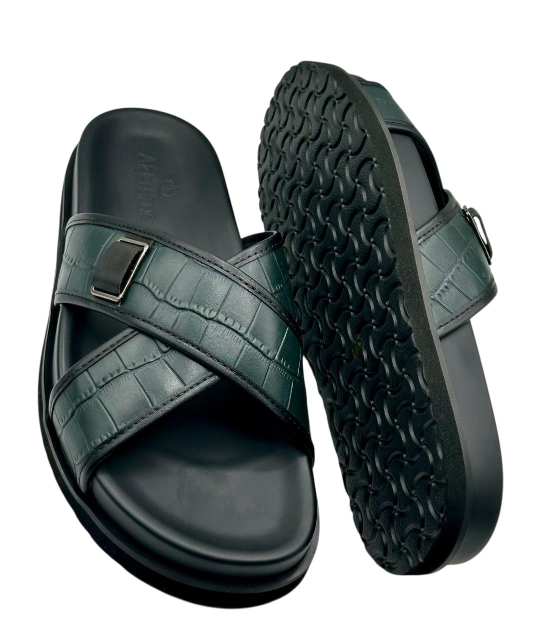 Modern crossover sandals with a rich green croc finish. Lightweight cushioning and excellent grip for all-day wear.