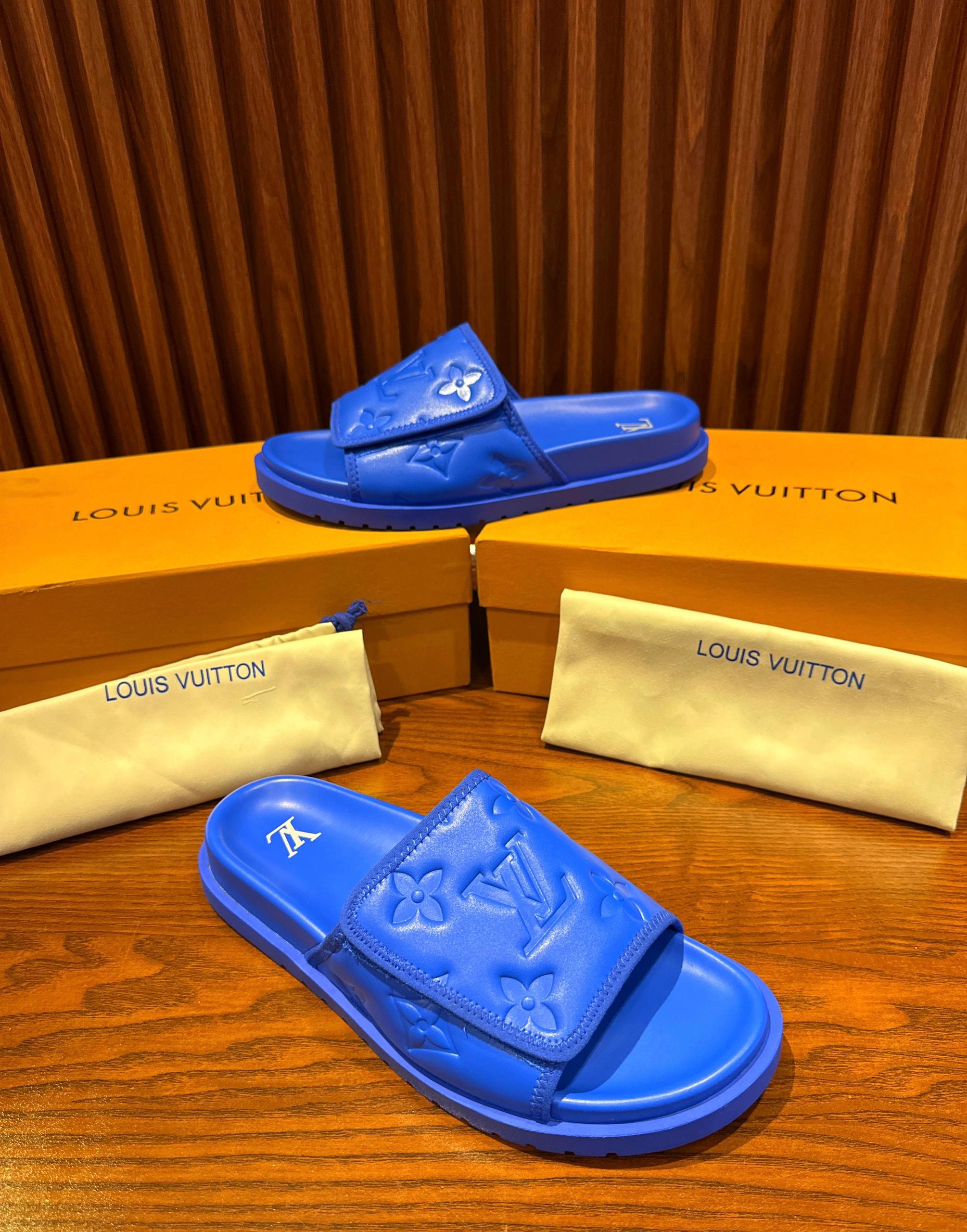 Crafted from premium materials, these vibrant blue slides feature the iconic embossed LV initials and Monogram flowers for a bold yet sophisticated look. Designed for both comfort and style, they offer a cushioned sole and secure strap, making them perfect for casual wear, travel, or elevating your everyday outfits. A statement piece that blends modern streetwear with timeless elegance, these slides embody Louis Vuitton’s signature craftsmanship.