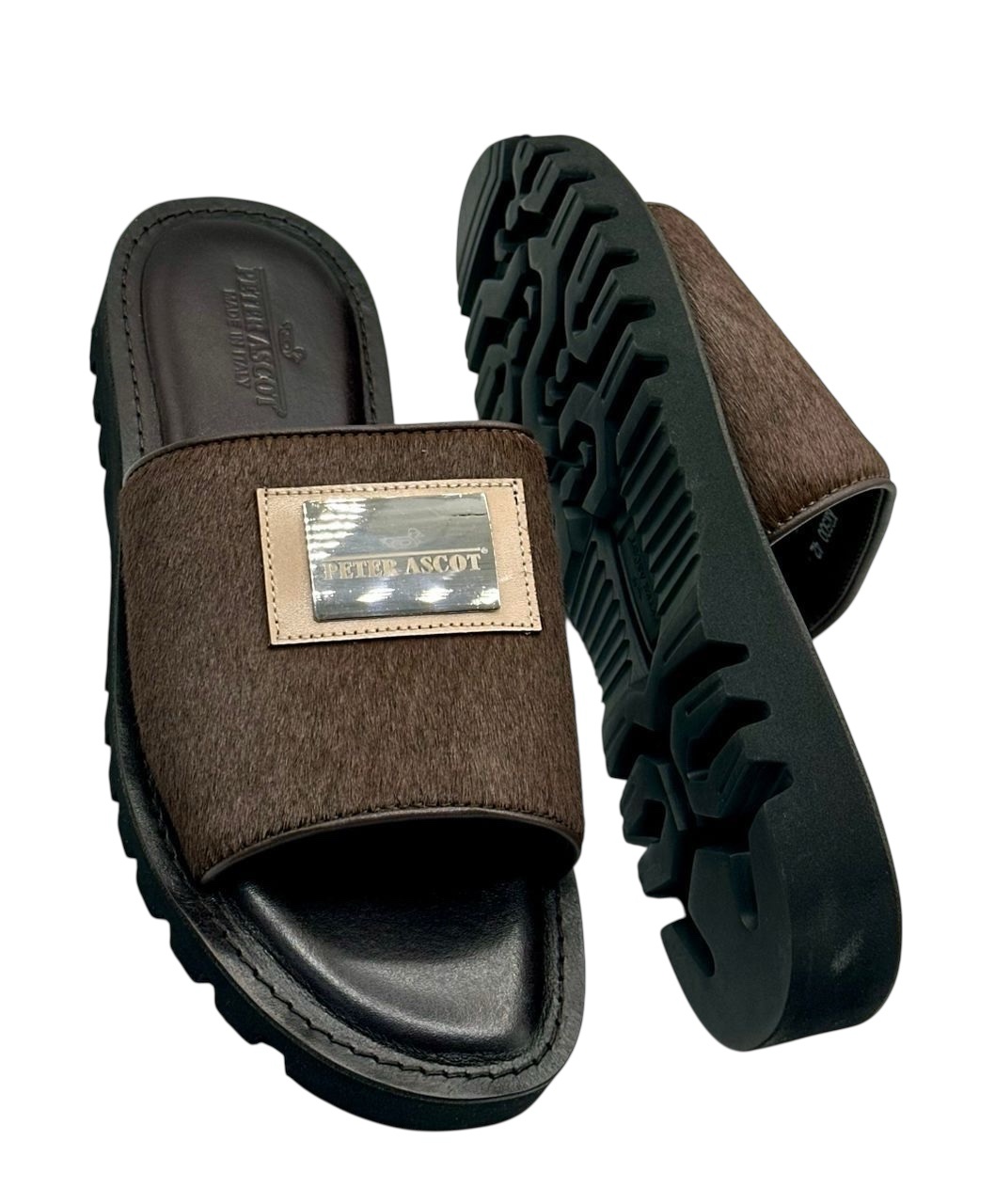 Unique fur-textured slides with a metallic brand plate. Rugged outsole ensures strong grip and standout style.