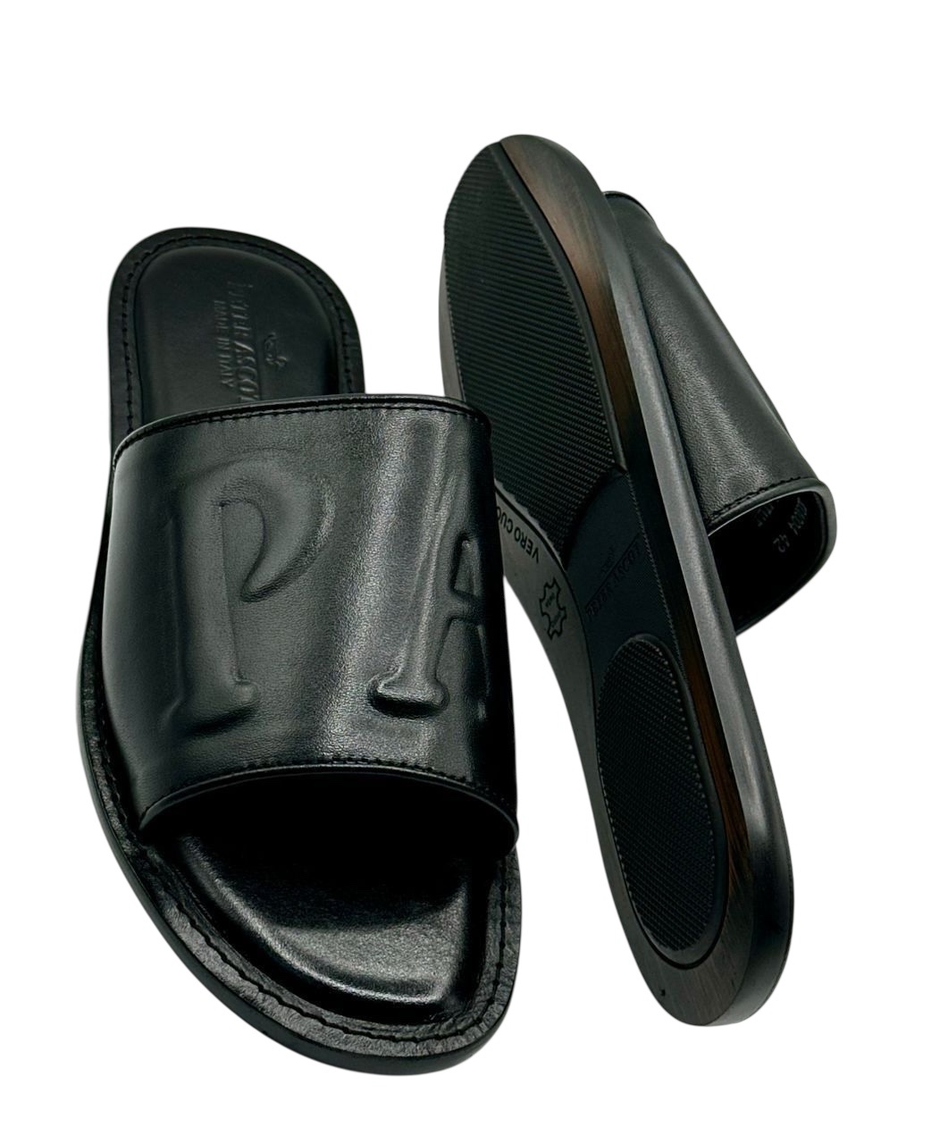 Sleek premium leather slides featuring bold embossed “PA” detailing and a cushioned footbed. Designed for everyday luxury and long-lasting comfort.